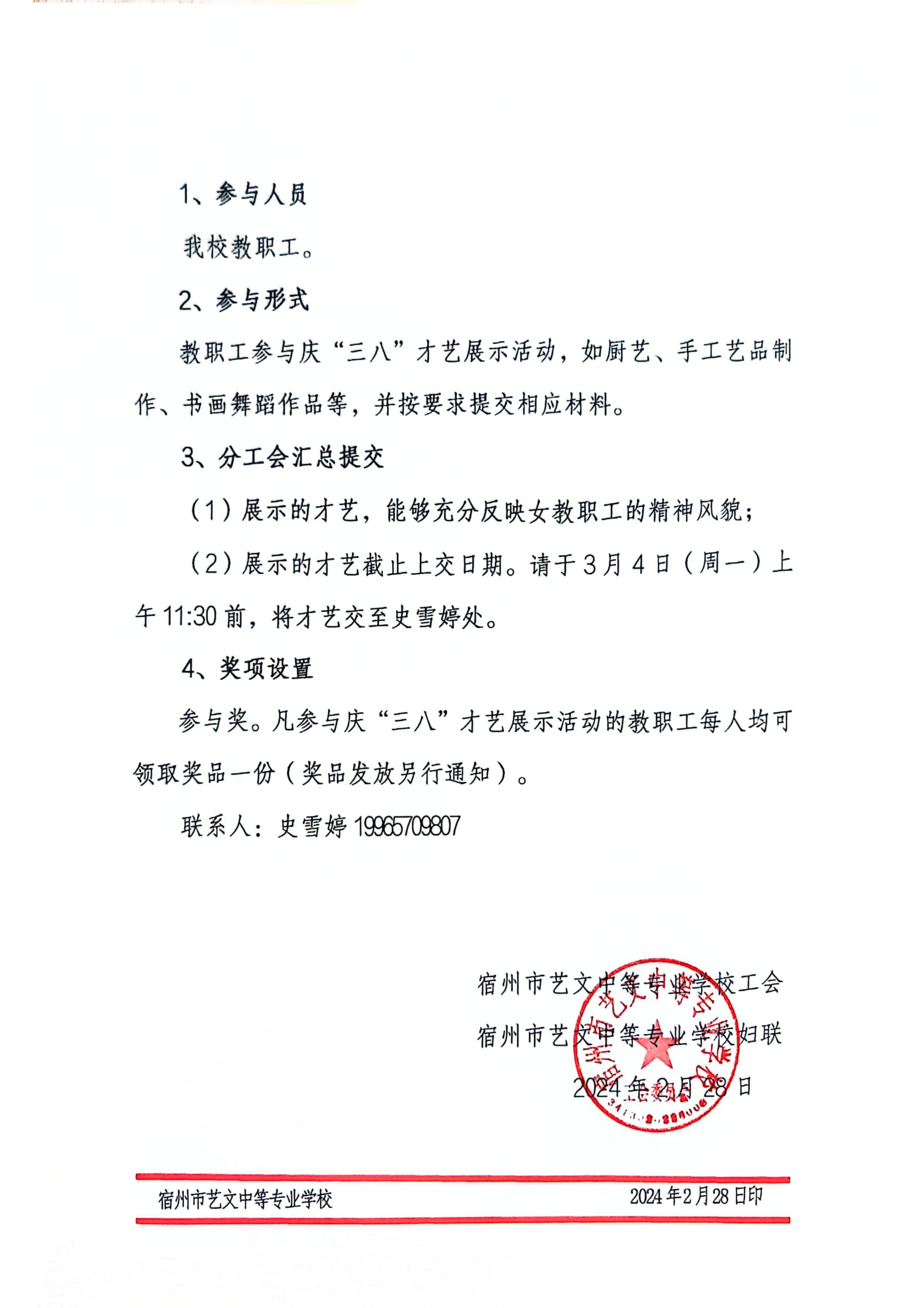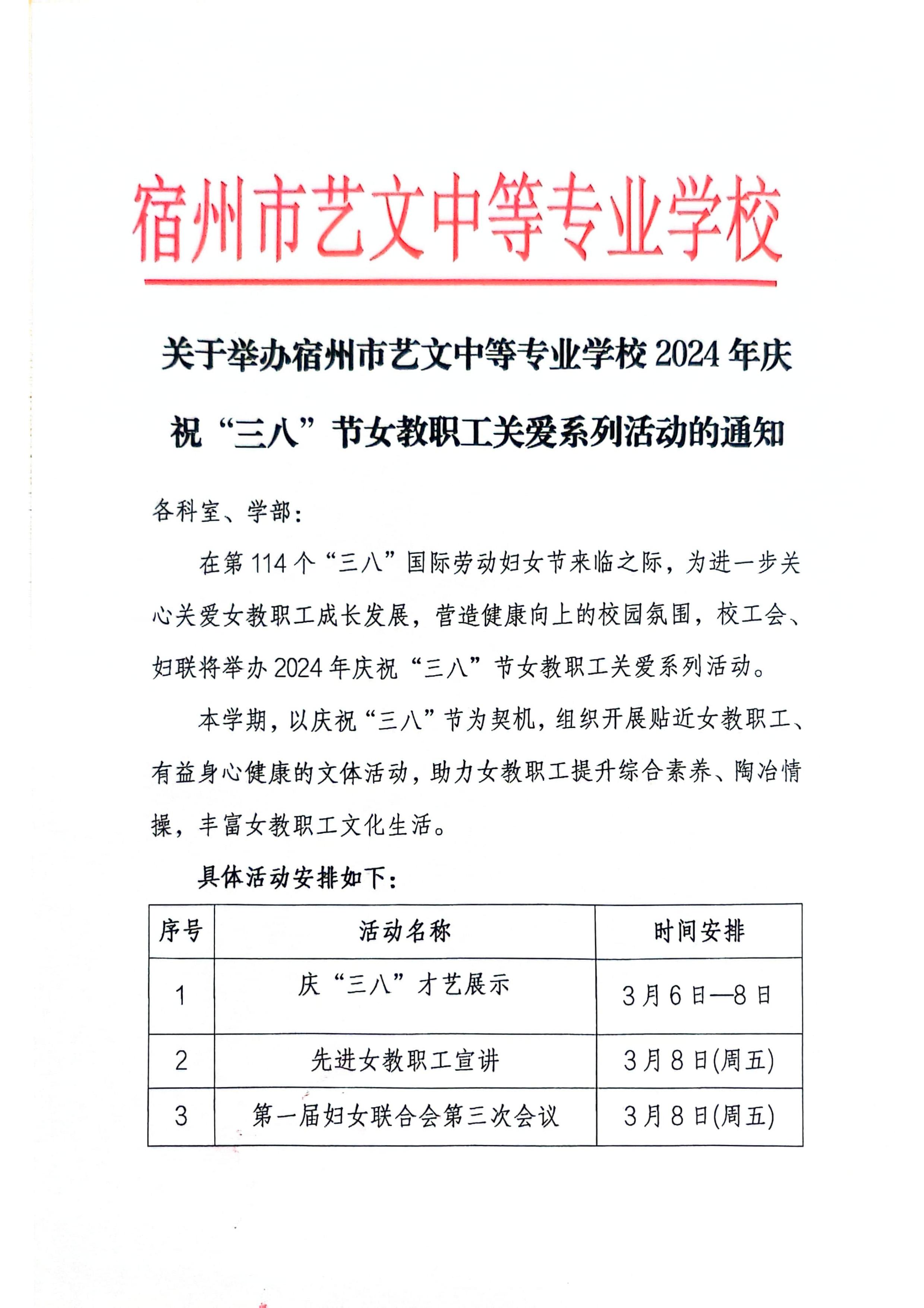 宿州市藝文學校2024年慶?!叭恕惫?jié)女職工關愛系統(tǒng)活動的通知