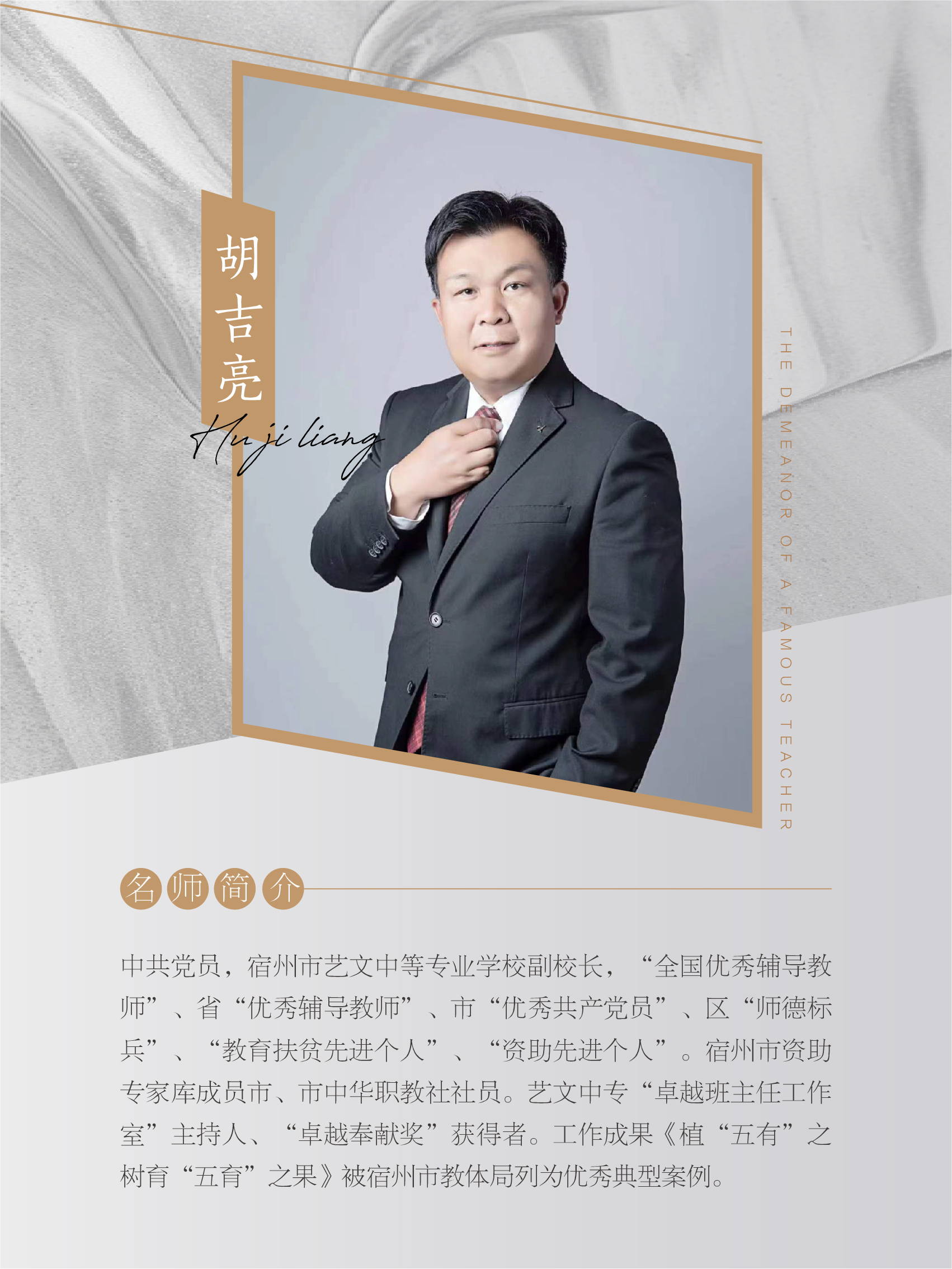 胡吉亮,男,現(xiàn)年43歲,宿州市“優(yōu)秀共產(chǎn)黨員”宿州市藝文中專學校副校長、食品安全總監(jiān),班主任。20年的教育生涯,他以卓越的業(yè)績和無私的奉獻精神,樹立了一個優(yōu)秀教師的標桿。