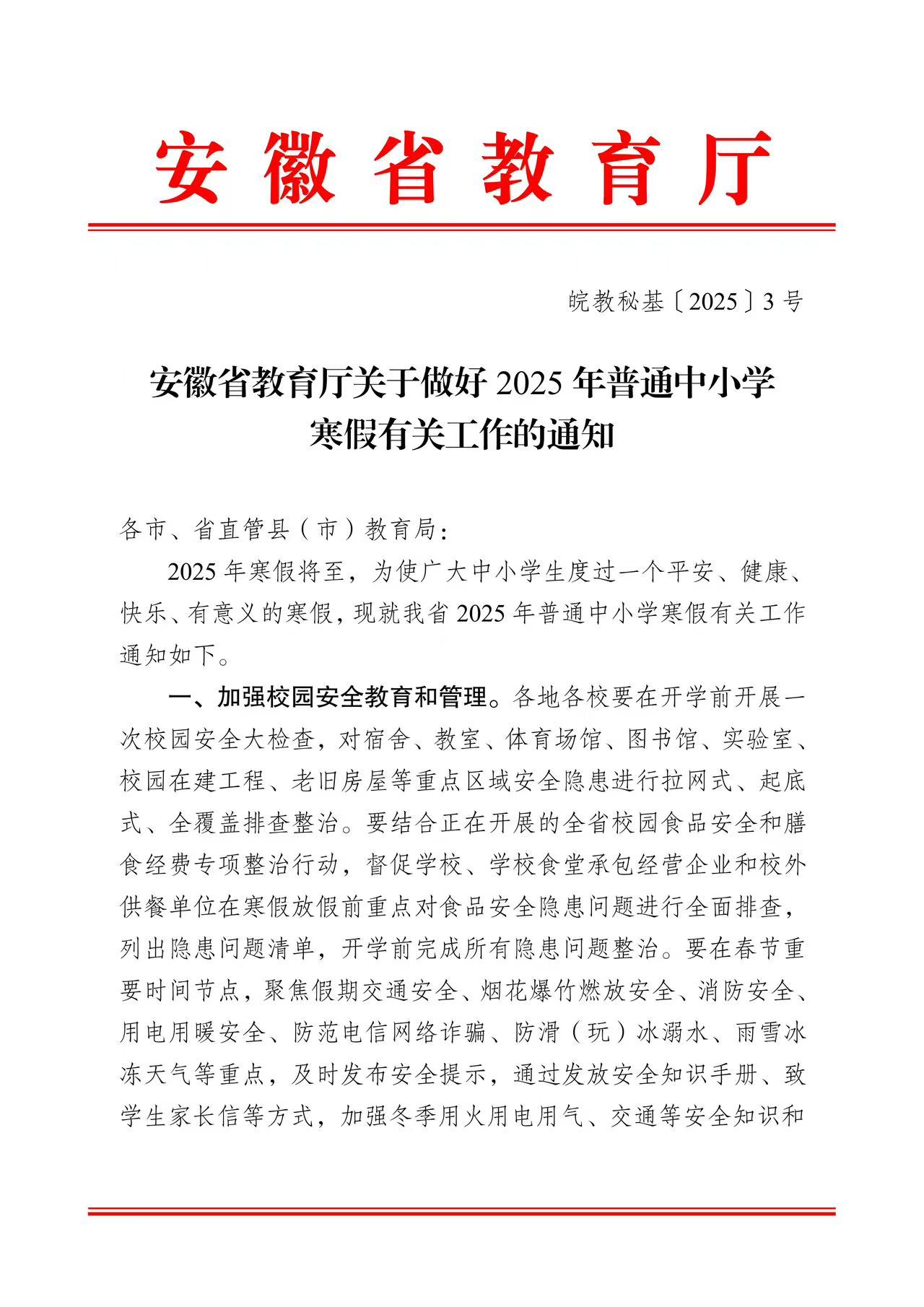 關(guān)于轉(zhuǎn)發(fā)《安徽省教育廳關(guān)于做好2025年普通中小學寒假有關(guān)工作的通知》的通知
