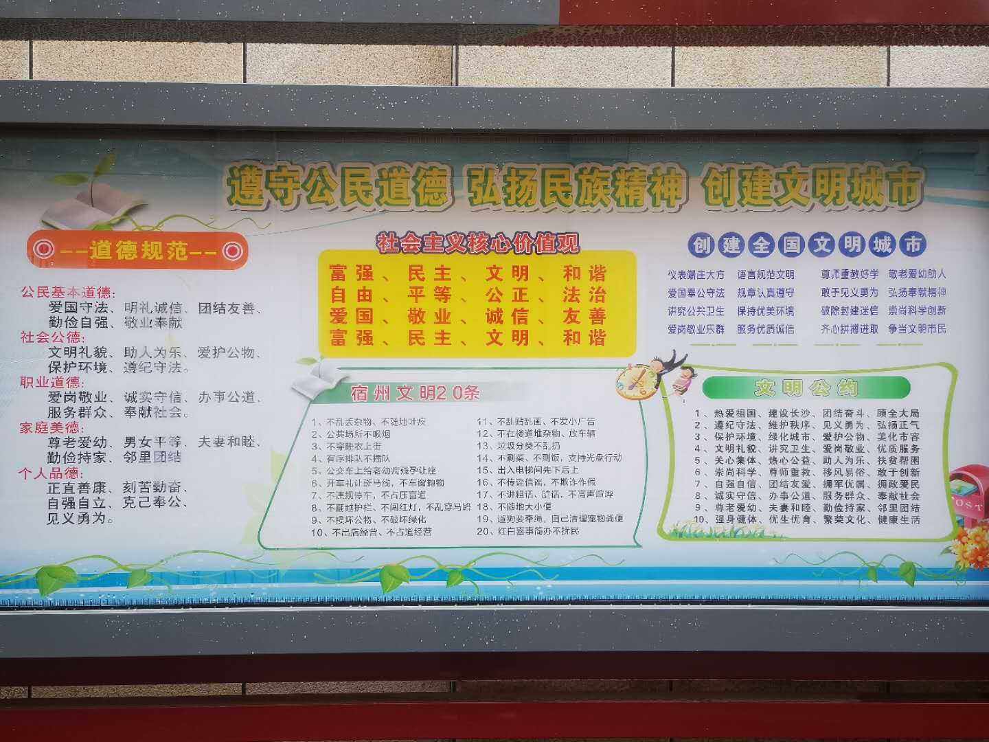二、加大宣傳力度。我校開辟文明宣傳專欄,宣傳《宿州文明20條》等文明禮儀。同時(shí)在各辦公室醒目位置張貼“24”字核心價(jià)值觀。并利用電子廣告牌滾動(dòng)展示文明創(chuàng)建內(nèi)容。