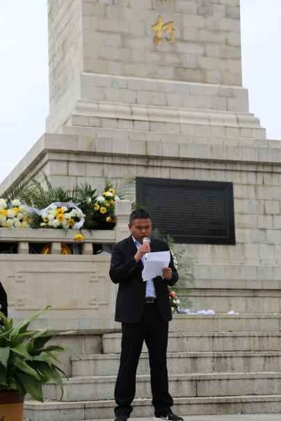 獻(xiàn)詞:學(xué)校領(lǐng)導(dǎo)馮沖、教師代表?xiàng)蠲?、學(xué)生代表劉孜在烈士紀(jì)念碑前獻(xiàn)詞。