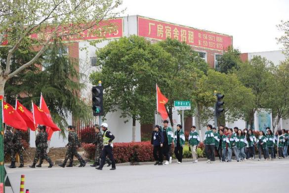 出發(fā):下午12時(shí)30分,兩排長(zhǎng)長(zhǎng)的隊(duì)伍,整齊劃一,同學(xué)們表情嚴(yán)肅,一步一步丈量著腳下的路。近兩個(gè)小時(shí)的徒步,沒(méi)有一個(gè)學(xué)生喊苦喊累,沒(méi)有一個(gè)學(xué)生掉隊(duì)。三輛交警鐵騎的護(hù)送,確保了學(xué)生安全。