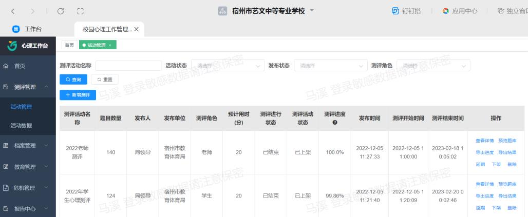心理篩查工作:開學(xué)伊始,各班進(jìn)行了紙質(zhì)心理問卷篩查工作,采用的是中學(xué)生心理健康量表,同時落實(shí)了“一生一案”工作。于12月份又進(jìn)行了全市統(tǒng)一的線上心理測評,藝文學(xué)校在規(guī)定時間內(nèi),教師與學(xué)生100%完成。測評后的快篩、輔導(dǎo)、上報(bào)工作也及時完成。