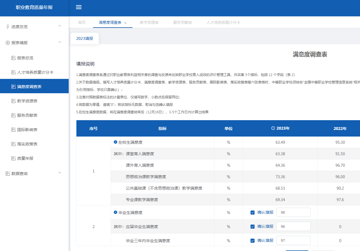 上述4類評價(jià)的結(jié)果只能作為教學(xué)教育質(zhì)量考核的第一維度,第二維度主要參考滿意度調(diào)查數(shù)據(jù)。即學(xué)校通過開展教職工、學(xué)生、家長、用人單位滿意度調(diào)查以及師生座談會等方式,獲得多元主體對學(xué)校教育教學(xué)質(zhì)量和人才培養(yǎng)質(zhì)量滿意度的相關(guān)數(shù)據(jù)。通過反饋的數(shù)據(jù),改進(jìn)教育教學(xué)模式,提高教學(xué)質(zhì)量,辦人民滿意的學(xué)校。