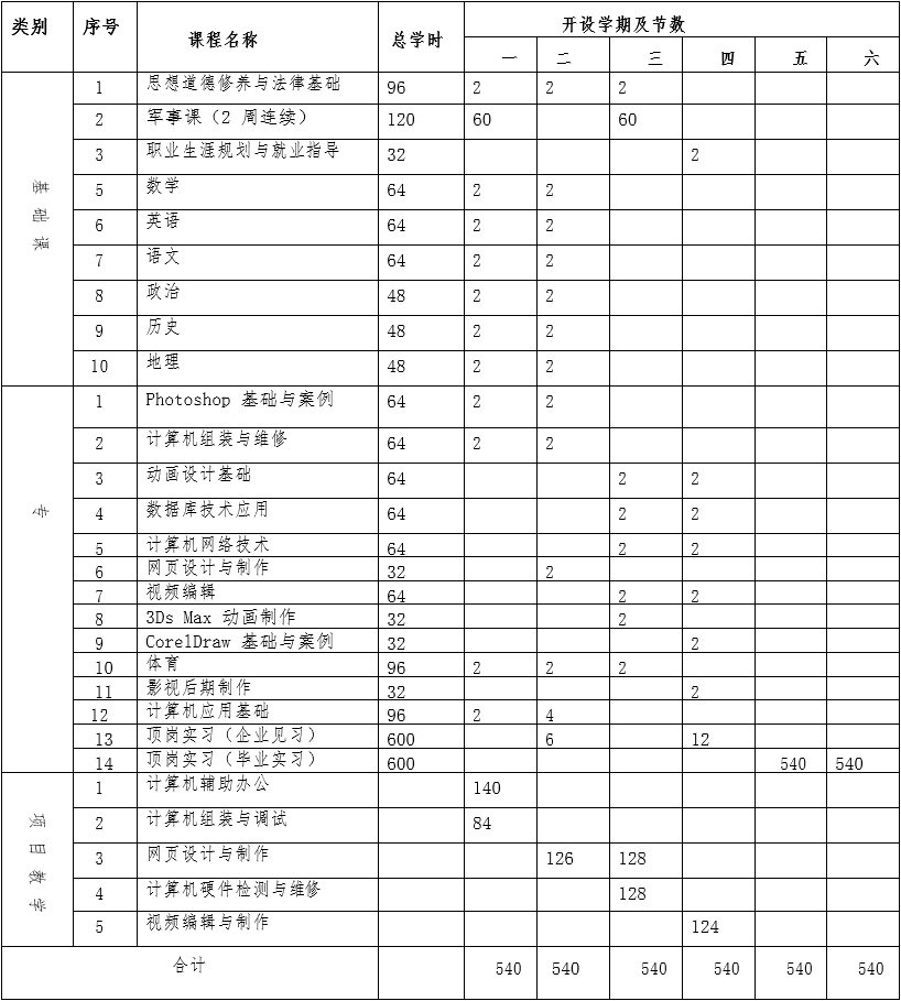 宿州市藝文中等專業(yè)學(xué)校各專業(yè)課程計劃安排
