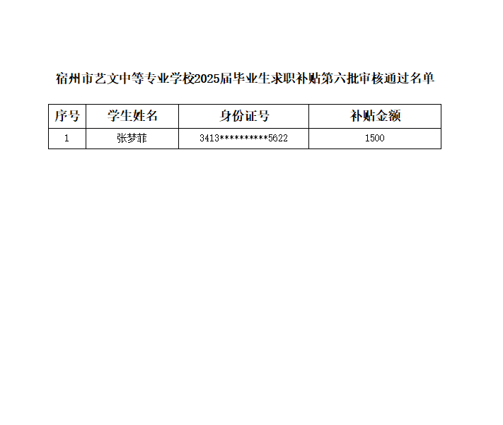 宿州市藝文中等專業(yè)學(xué)校2025屆畢業(yè)生求職補(bǔ)貼第六批審核通過名單公示